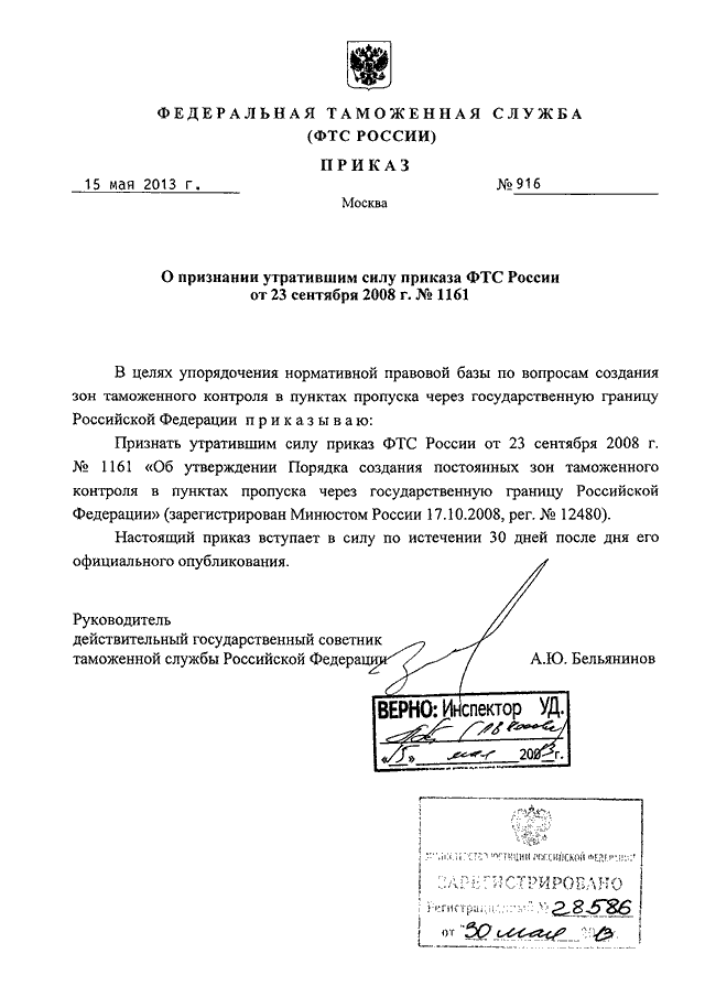 ПРИКАЗ ФТС РФ от 15.05.2013 N 916