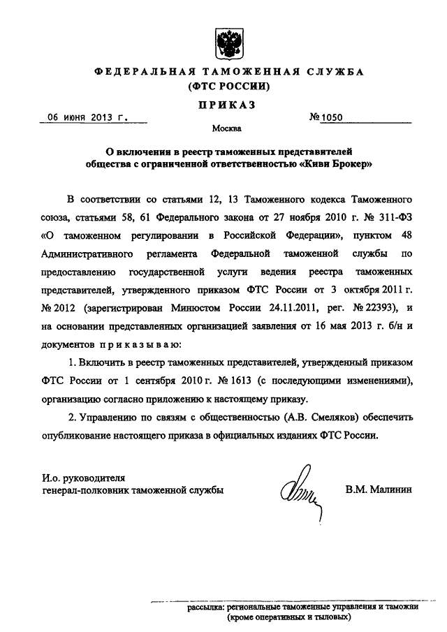ПРИКАЗ ФТС РФ от 06.06.2013 N 1050