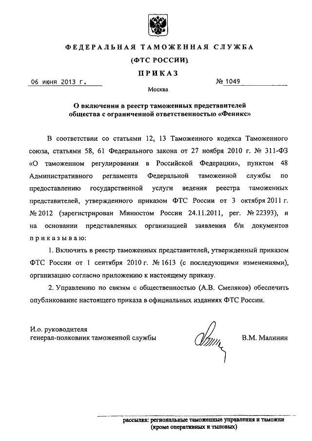 "О ВКЛЮЧЕНИИ В РЕЕСТР ТАМОЖЕННЫХ ПРЕДСТАВИТЕЛЕЙ ОБЩЕСТВА С ОГРАНИЧЕННОЙ ОТВЕТСТВЕННОСТЬЮ "ФЕНИКС"