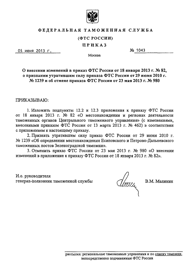 "О ВНЕСЕНИИ ИЗМЕНЕНИЙ В ПРИКАЗ ФТС РОССИИ ОТ 18 ЯНВАРЯ 2013 Г. N 82, О ПРИЗНАНИИ УТРАТИВШИМ СИЛУ ПРИКАЗА ФТС РОССИИ ОТ 29 ИЮНЯ 2010 Г. N 1239 И ОБ ОТМЕНЕ ПРИКАЗА ФТС РОССИИ ОТ 23 МАЯ 2013 Г. N 980"