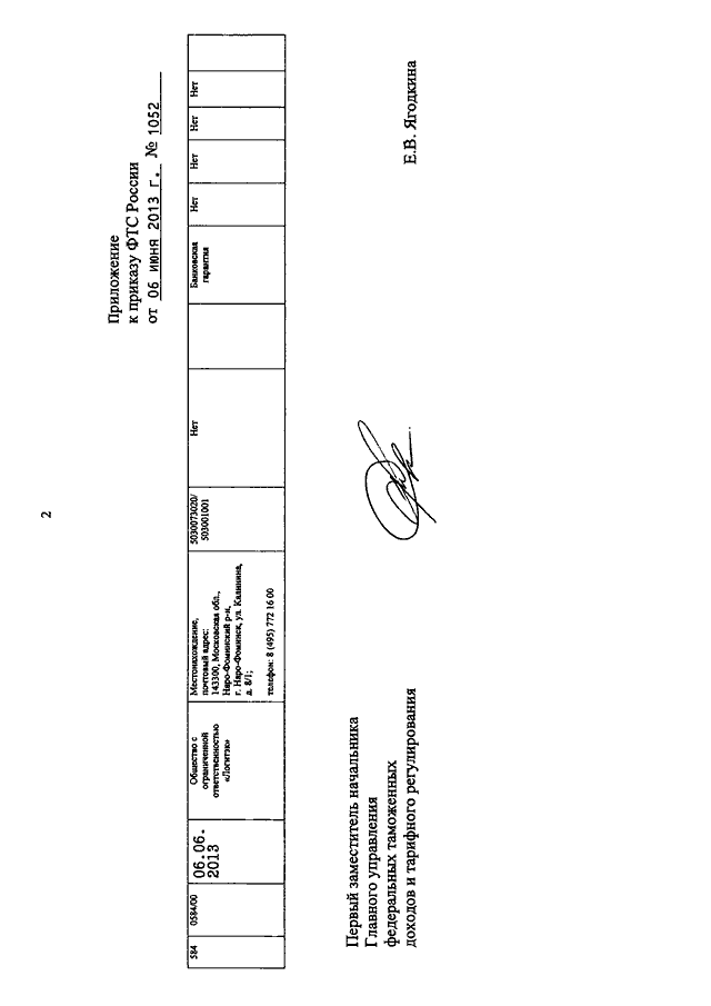 ПРИКАЗ ФТС РФ от 06.06.2013 N 1052