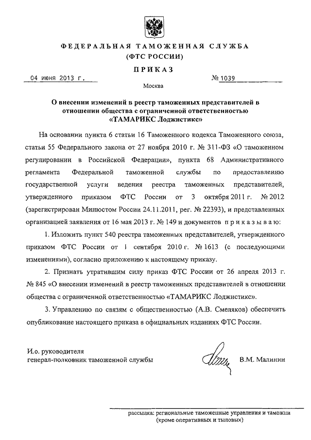 ПРИКАЗ ФТС РФ от 04.06.2013 N 1039