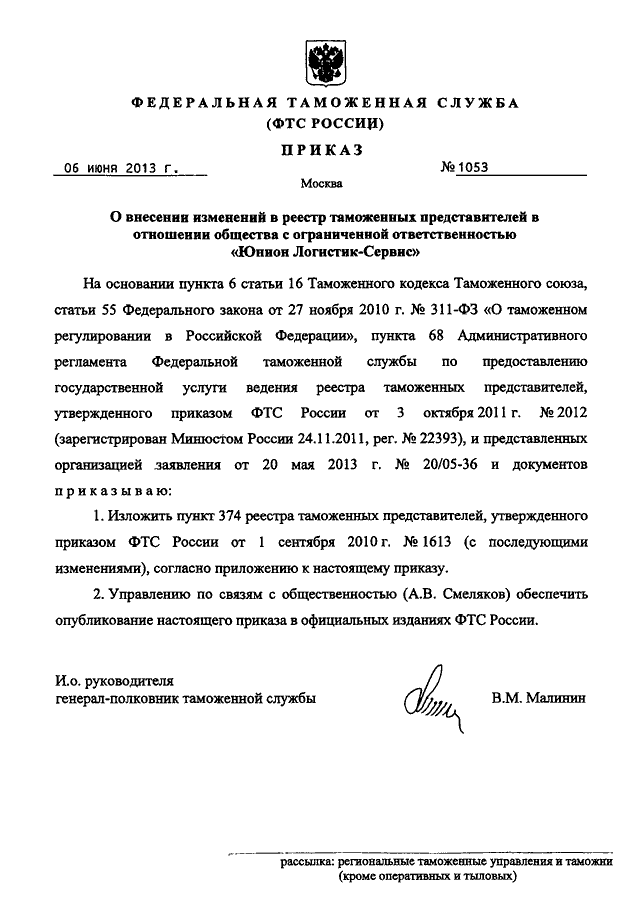 ПРИКАЗ ФТС РФ от 06.06.2013 N 1053