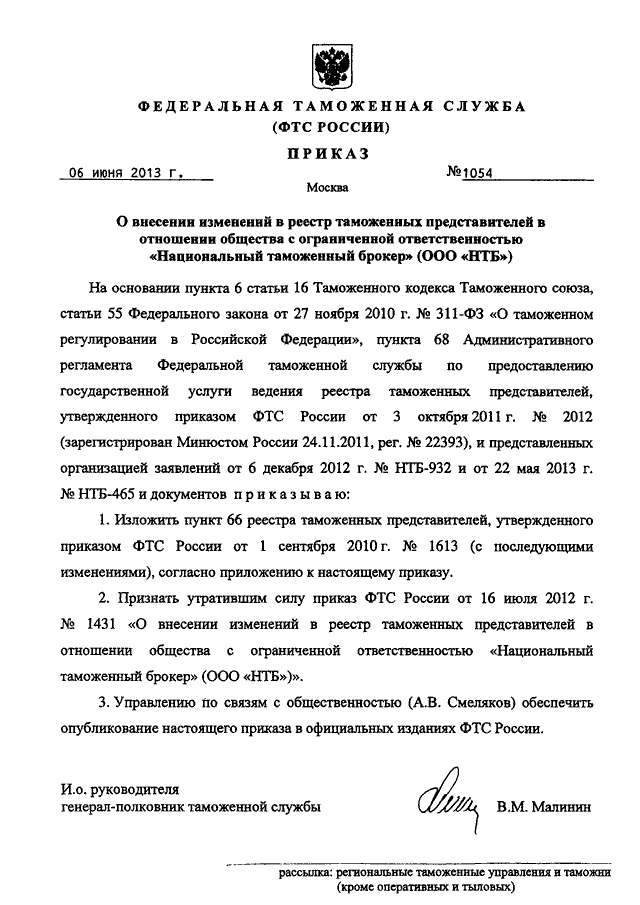 ПРИКАЗ ФТС РФ от 06.06.2013 N 1054