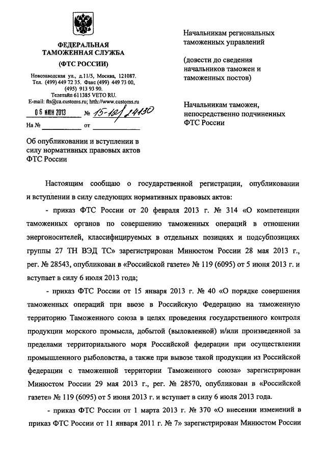 "ОБ ОПУБЛИКОВАНИИ И ВСТУПЛЕНИИ В СИЛУ НОРМАТИВНЫХ ПРАВОВЫХ АКТОВ ФТС РОССИИ"
