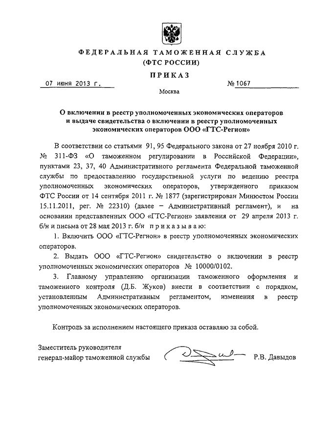 "О ВКЛЮЧЕНИИ В РЕЕСТР УПОЛНОМОЧЕННЫХ ЭКОНОМИЧЕСКИХ ОПЕРАТОРОВ И ВЫДАЧЕ СВИДЕТЕЛЬСТВА О ВКЛЮЧЕНИИ В РЕЕСТР УПОЛНОМОЧЕННЫХ ЭКОНОМИЧЕСКИХ ОПЕРАТОРОВ ООО "ГТС-РЕГИОН"