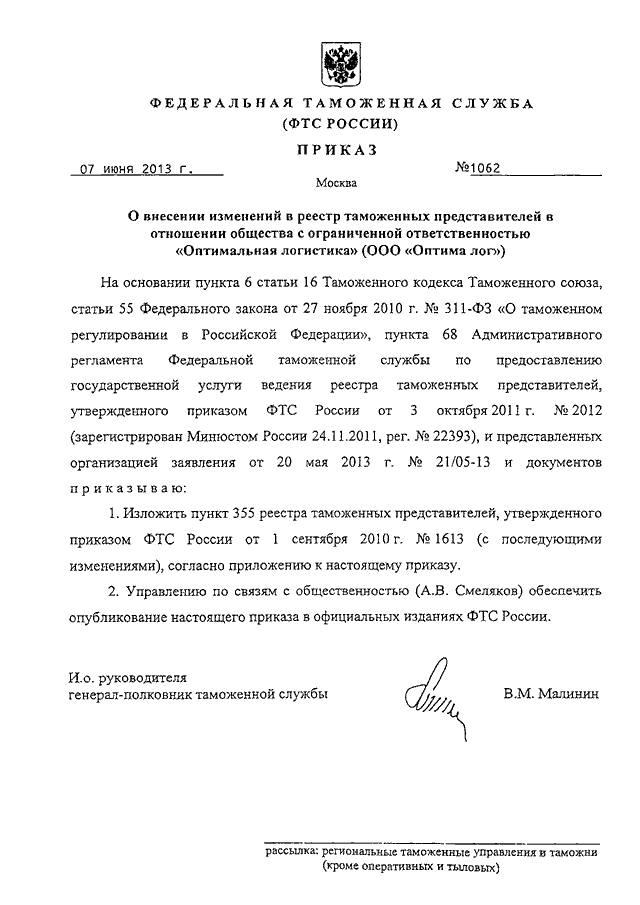 ПРИКАЗ ФТС РФ от 07.06.2013 N 1062