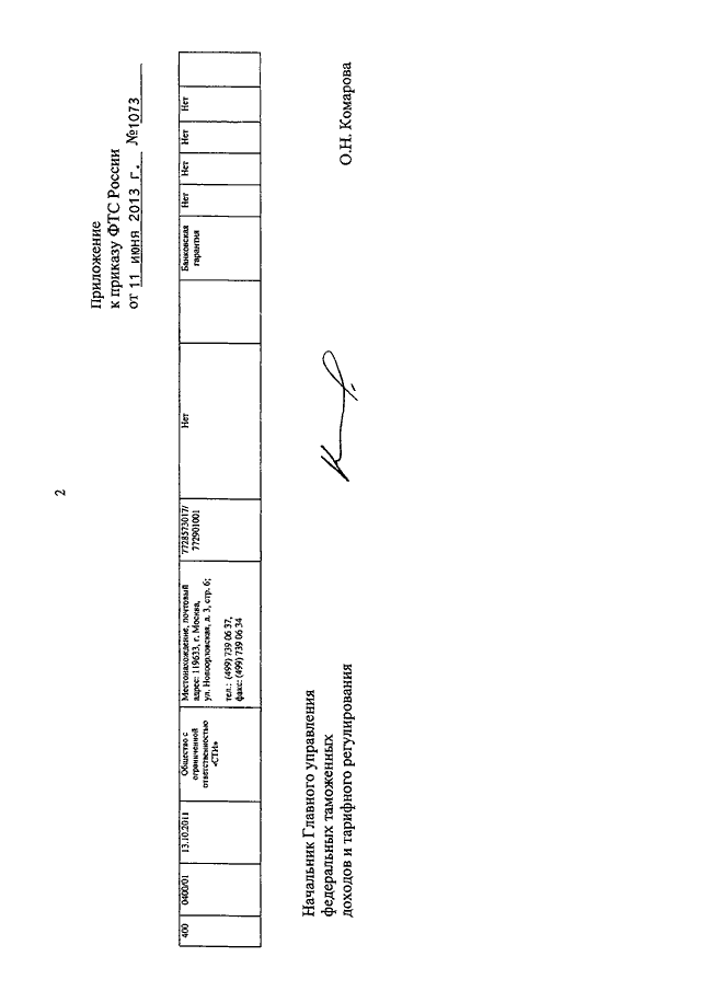 ПРИКАЗ ФТС РФ от 11.06.2013 N 1073