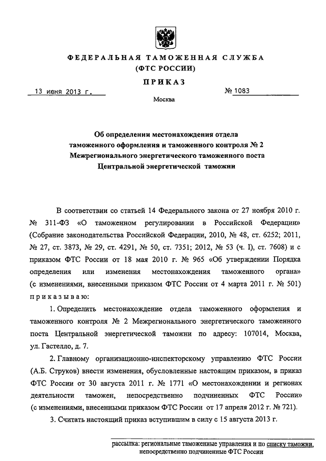 ПРИКАЗ ФТС РФ от 13.06.2013 N 1083