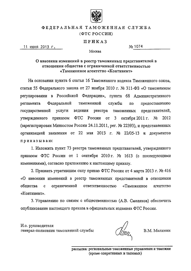 ПРИКАЗ ФТС РФ от 11.06.2013 N 1074