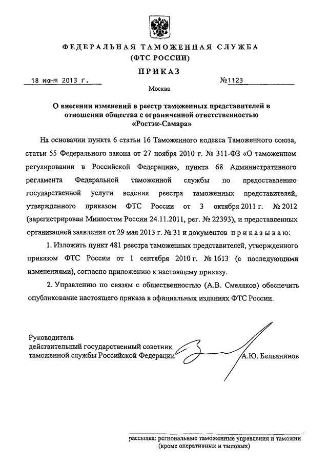 ПРИКАЗ ФТС РФ от 18.06.2013 N 1123