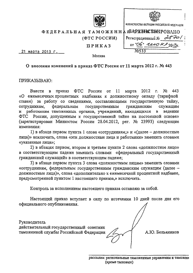 ПРИКАЗ ФТС РФ от 21.03.2013 N 533