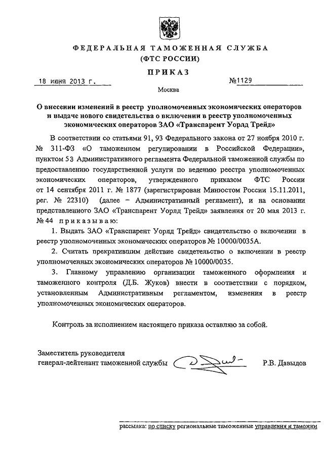 "О ВНЕСЕНИИ ИЗМЕНЕНИЙ В РЕЕСТР УПОЛНОМОЧЕННЫХ ЭКОНОМИЧЕСКИХ ОПЕРАТОРОВ И ВЫДАЧЕ НОВОГО СВИДЕТЕЛЬСТВА О ВКЛЮЧЕНИИ В РЕЕСТР УПОЛНОМОЧЕННЫХ ЭКОНОМИЧЕСКИХ ОПЕРАТОРОВ ЗАО "ТРАНСПАРЕНТ УОРЛД ТРЕЙД"