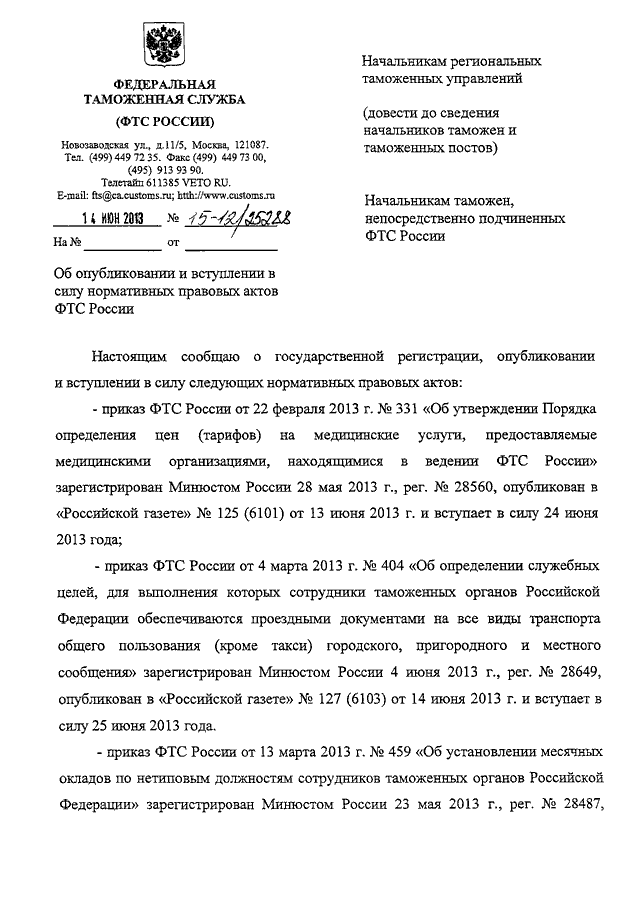"ОБ ОПУБЛИКОВАНИИ И ВСТУПЛЕНИИ В СИЛУ НОРМАТИВНЫХ ПРАВОВЫХ АКТОВ ФТС РОССИИ"