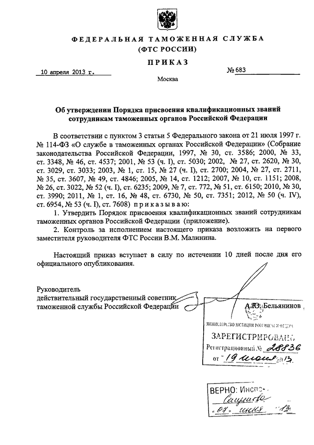 ПРИКАЗ ФТС РФ от 10.04.2013 N 683