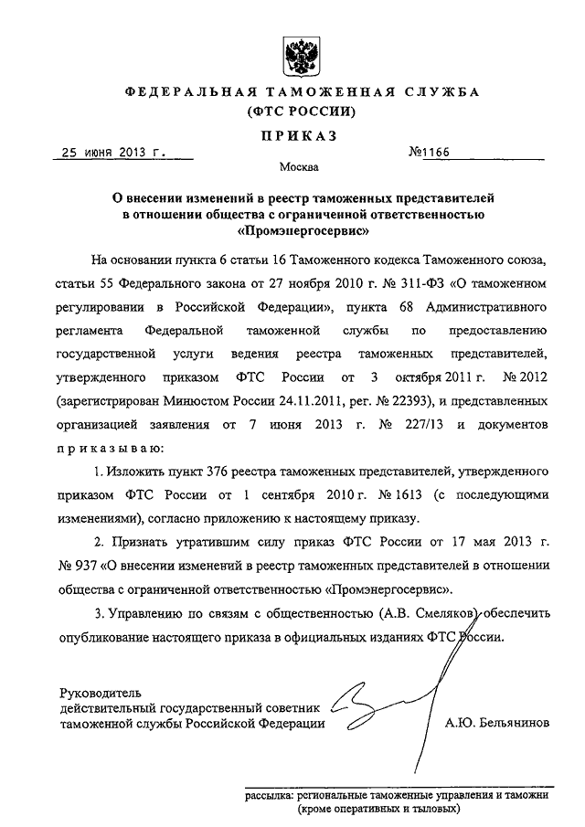 ПРИКАЗ ФТС РФ от 25.06.2013 N 1166