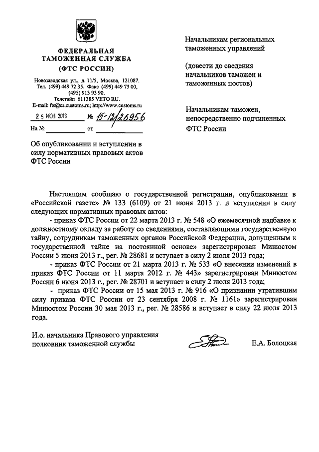 "ОБ ОПУБЛИКОВАНИИ И ВСТУПЛЕНИИ В СИЛУ НОРМАТИВНЫХ ПРАВОВЫХ АКТОВ ФТС РОССИИ"