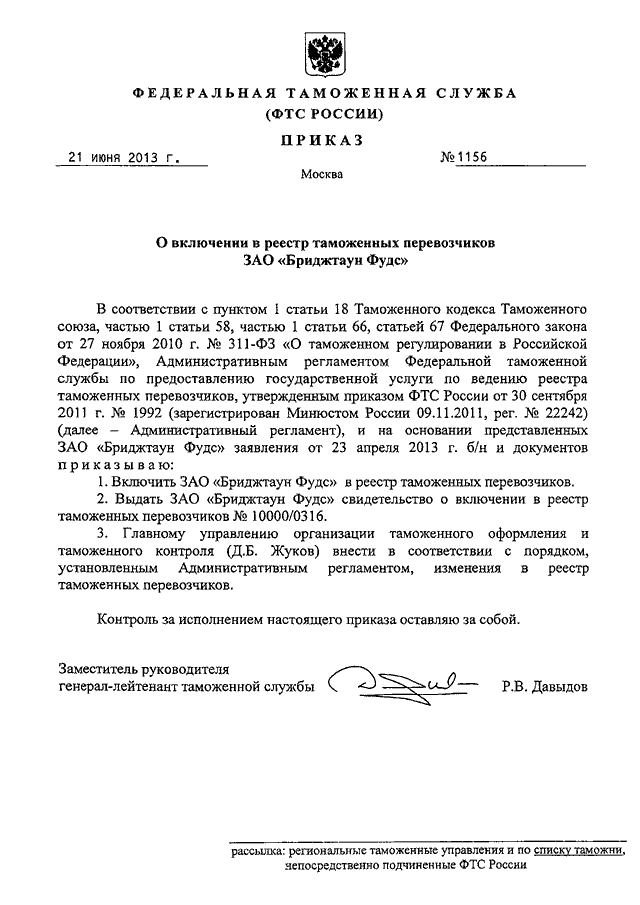 ПРИКАЗ ФТС РФ от 21.06.2013 N 1156