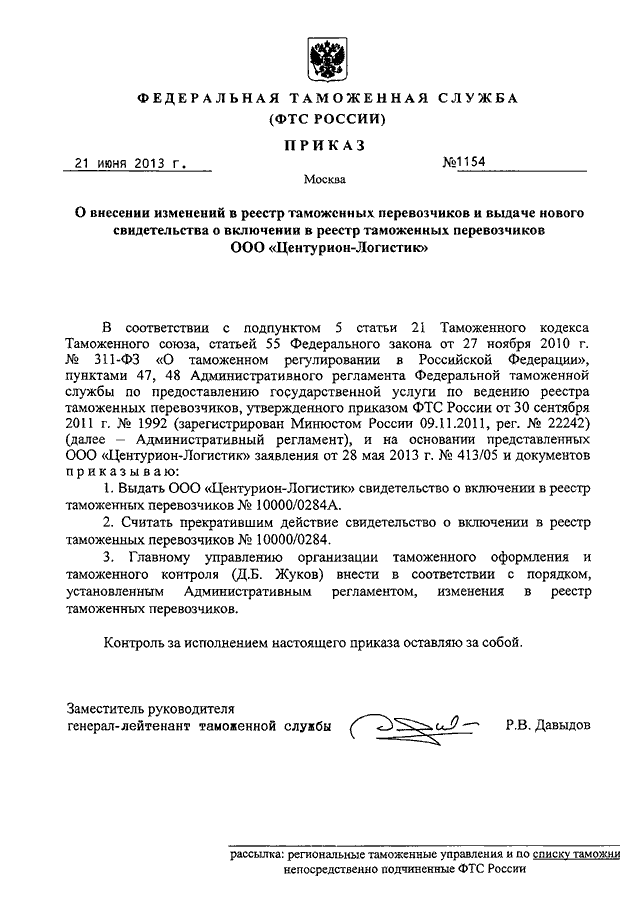 ПРИКАЗ ФТС РФ от 21.06.2013 N 1154