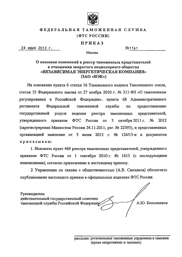 ПРИКАЗ ФТС РФ от 24.06.2013 N 1161