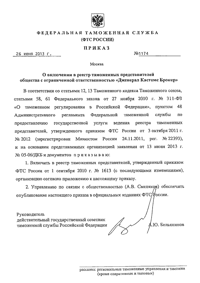 ПРИКАЗ ФТС РФ от 26.06.2013 N 1174