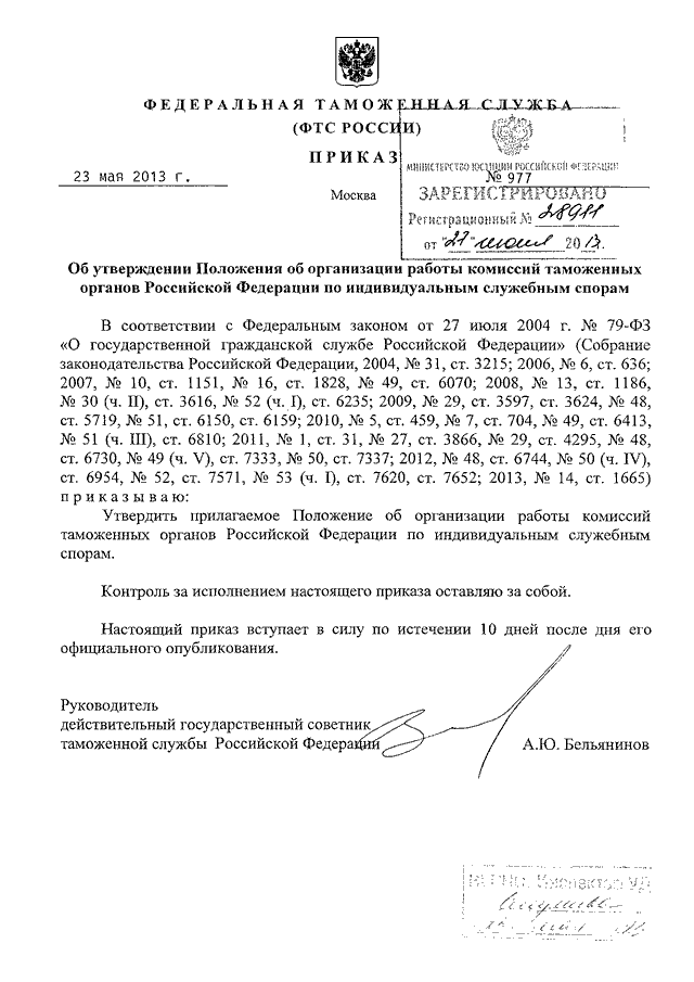 ПРИКАЗ ФТС РФ от 23.05.2013 N 977