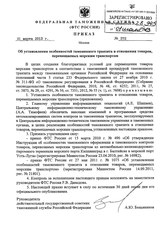 ПРИКАЗ ФТС РФ от 01.03.2013 N 372