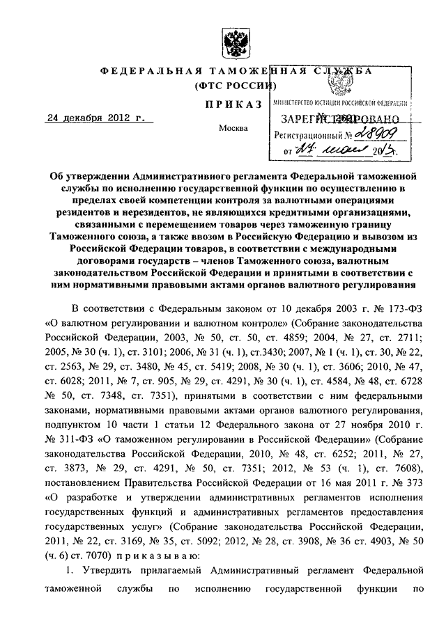 "ОБ УТВЕРЖДЕНИИ АДМИНИСТРАТИВНОГО РЕГЛАМЕНТА ФЕДЕРАЛЬНОЙ ТАМОЖЕННОЙ СЛУЖБЫ ПО ИСПОЛНЕНИЮ ГОСУДАРСТВЕННОЙ ФУНКЦИИ ПО ОСУЩЕСТВЛЕНИЮ В ПРЕДЕЛАХ СВОЕЙ КОМПЕТЕНЦИИ КОНТРОЛЯ ЗА ВАЛЮТНЫМИ ОПЕРАЦИЯМИ РЕЗИДЕНТОВ И НЕРЕЗИДЕНТОВ, НЕ ЯВЛЯЮЩИХСЯ КРЕДИТНЫМИ ОРГАНИЗАЦИЯМИ, СВЯЗАННЫМИ С ПЕРЕМЕЩЕНИЕМ ТОВАРОВ ЧЕРЕЗ ТАМОЖЕННУЮ ГРАНИЦУ ТАМОЖЕННОГО СОЮЗА, А ТАКЖЕ ВВОЗОМ В РОССИЙСКУЮ ФЕДЕРАЦИЮ И ВЫВОЗОМ ИЗ РОССИЙСКОЙ ФЕДЕРАЦИИ ТОВАРОВ, В СООТВЕТСТВИИ С МЕЖДУНАРОДНЫМИ ДОГОВОРАМИ ГОСУДАРСТВ - ЧЛЕНОВ ТАМОЖЕННОГО СОЮЗА, ВАЛЮТНЫМ ЗАКОНОДАТЕЛЬСТВОМ РОССИЙСКОЙ ФЕДЕРАЦИИ И ПРИНЯТЫМИ В СООТВЕТСТВИИ С НИМ НОРМАТИВНЫМИ ПРАВОВЫМИ АКТАМИ ОРГАНОВ ВАЛЮТНОГО РЕГУЛИРОВАНИЯ"