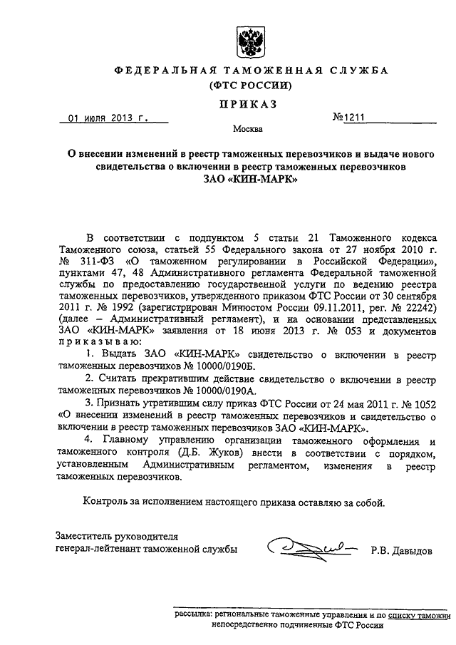 "О ВНЕСЕНИИ ИЗМЕНЕНИЙ В РЕЕСТР ТАМОЖЕННЫХ ПЕРЕВОЗЧИКОВ И ВЫДАЧЕ НОВОГО СВИДЕТЕЛЬСТВА О ВКЛЮЧЕНИИ В РЕЕСТР ТАМОЖЕННЫХ ПЕРЕВОЗЧИКОВ ЗАО "КИН-МАРК"