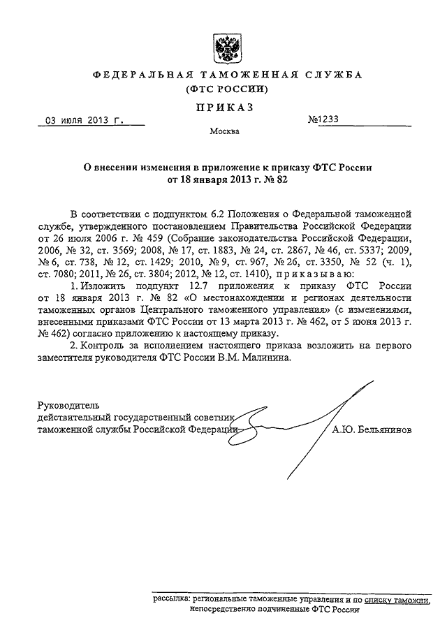 ПРИКАЗ ФТС РФ от 03.07.2013 N 1233