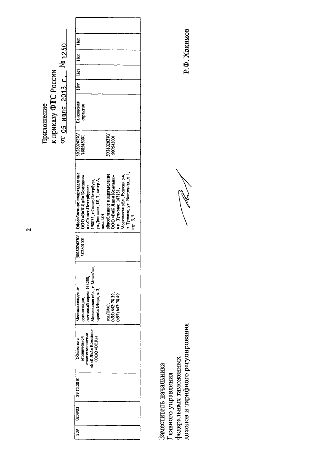 ПРИКАЗ ФТС РФ от 05.07.2013 N 1250