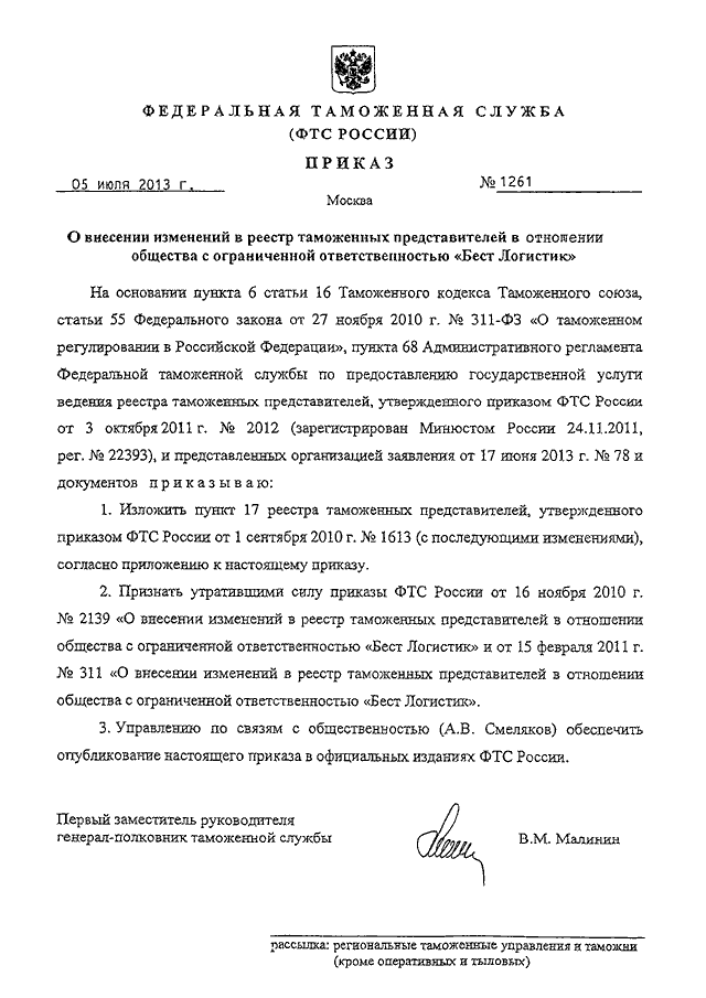 ПРИКАЗ ФТС РФ от 05.07.2013 N 1261