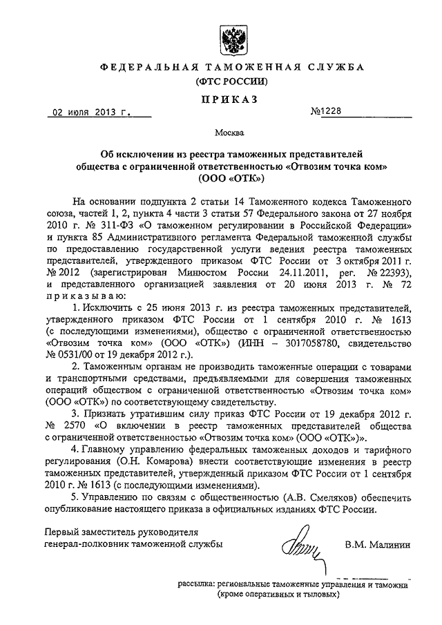 ПРИКАЗ ФТС РФ от 02.07.2013 N 1228