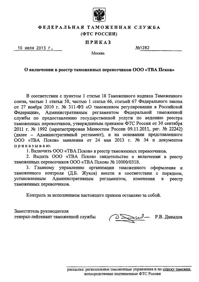 "О ВКЛЮЧЕНИИ В РЕЕСТР ТАМОЖЕННЫХ ПЕРЕВОЗЧИКОВ ООО "ТВА ПСКОВ"