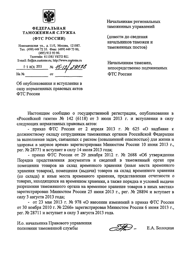 "ОБ ОПУБЛИКОВАНИИ И ВСТУПЛЕНИИ В СИЛУ НОРМАТИВНЫХ ПРАВОВЫХ АКТОВ ФТС РОССИИ"
