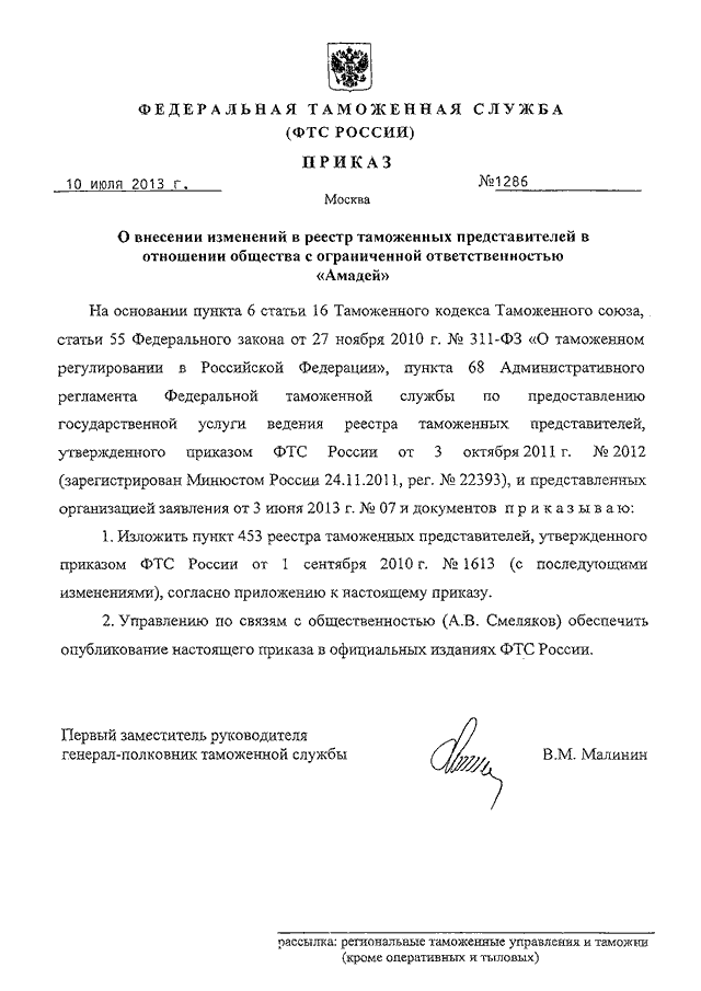ПРИКАЗ ФТС РФ от 10.07.2013 N 1286