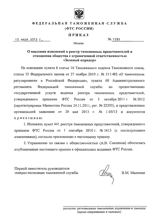 ПРИКАЗ ФТС РФ от 10.07.2013 N 1285