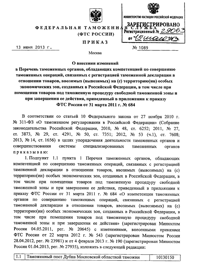 ПРИКАЗ ФТС РФ от 13.06.2013 N 1089 "О ВНЕСЕНИИ ИЗМЕНЕНИЙ В ПЕРЕЧЕНЬ ТАМОЖЕННЫХ ОРГАНОВ, ОБЛАДАЮЩИХ