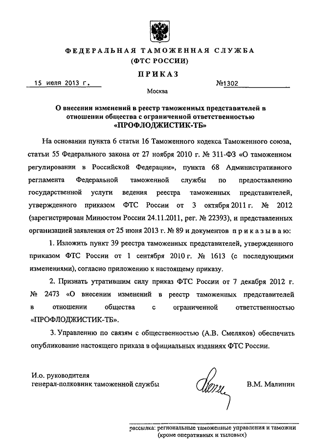 ПРИКАЗ ФТС РФ от 15.07.2013 N 1302