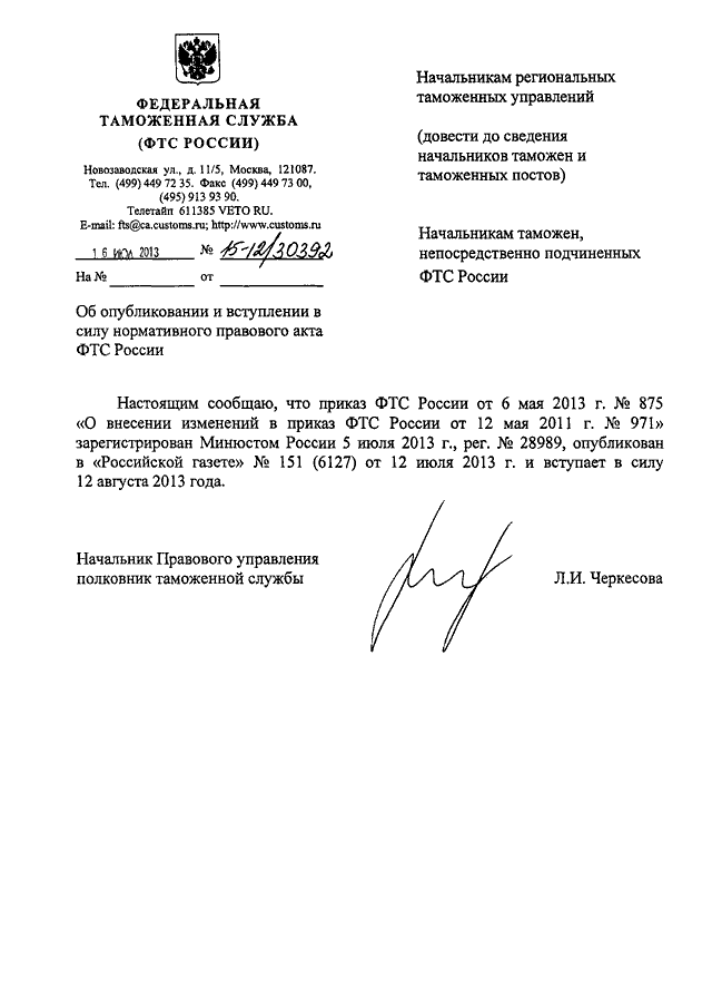 "ОБ ОПУБЛИКОВАНИИ И ВСТУПЛЕНИИ В СИЛУ НОРМАТИВНОГО ПРАВОВОГО АКТА ФТС РОССИИ"