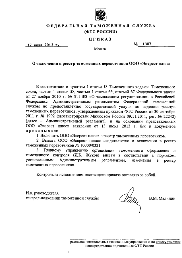 ПРИКАЗ ФТС РФ от 17.07.2013 N 1307