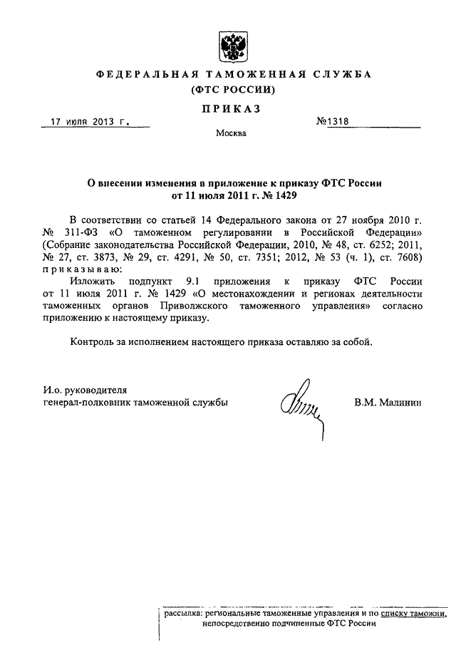 ПРИКАЗ ФТС РФ от 17.07.2013 N 1318