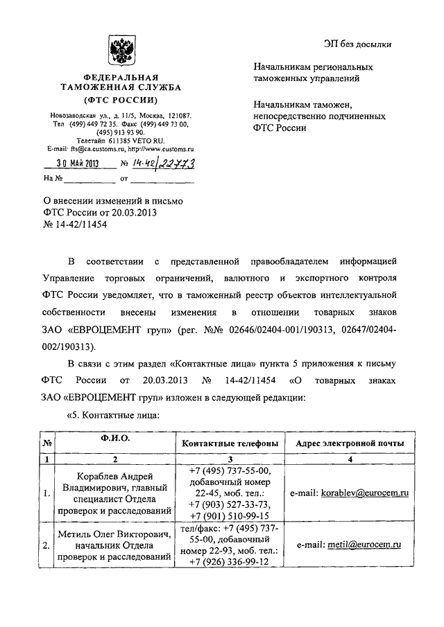 "О ВНЕСЕНИИ ИЗМЕНЕНИЙ В ПИСЬМО ФТС РОССИИ ОТ 20.03.2013 N 14-42/11454"