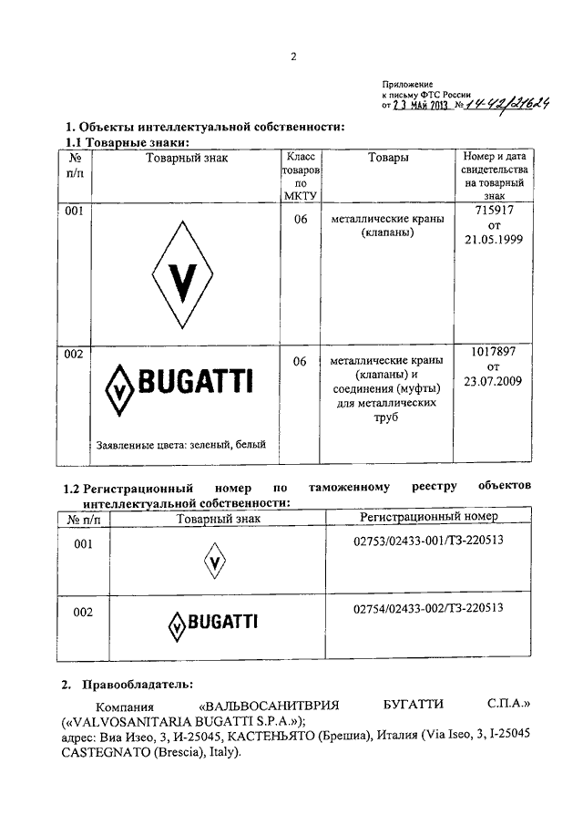 "О ТОВАРНЫХ ЗНАКАХ КОМПАНИИ "VALVOSANITARIA BUGATTI S.P.A."