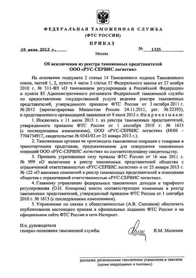 ПРИКАЗ ФТС РФ от 19.07.2013 N 1335