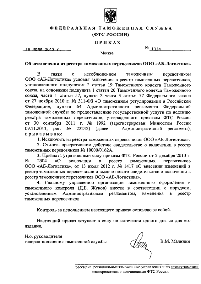 ПРИКАЗ ФТС РФ от 18.07.2013 N 1334