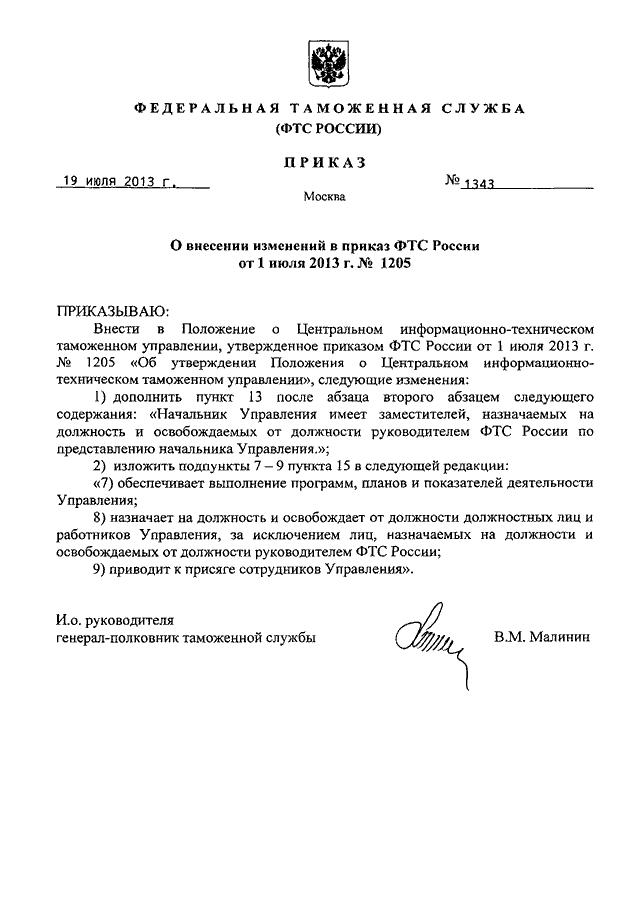 ПРИКАЗ ФТС РФ от 19.07.2013 N 1343