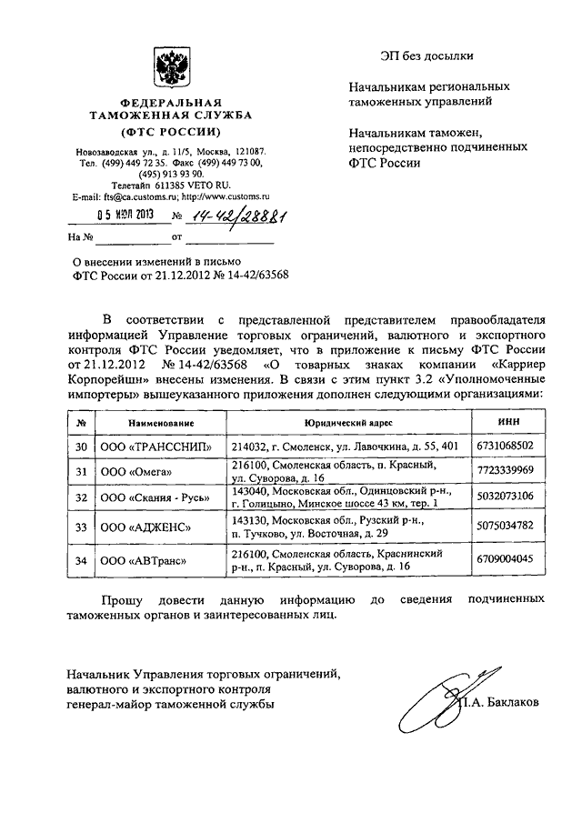 "О ВНЕСЕНИИ ИЗМЕНЕНИЙ В ПИСЬМО ФТС РОССИИ ОТ 21.12.2012 N 14-42/63568"