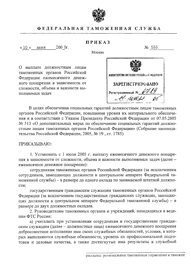 ПРИКАЗ ФТС РФ от 10.06.2005 N 533 "О ВЫПЛАТЕ ДОЛЖНОСТНЫМ ЛИЦАМ ТАМОЖЕННЫХ ОРГАНОВ РОССИЙСКОЙ