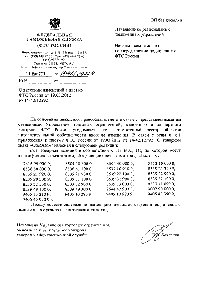 ПИСЬМО ФТС РФ от 17.05.2013 N 14-42/20554